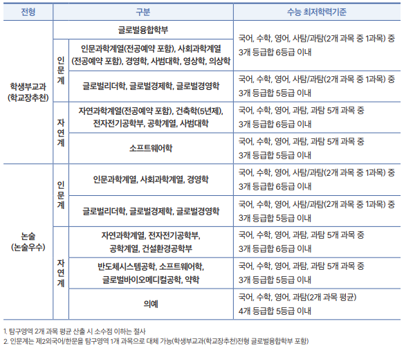 (반도체시스템공학과, 소프트웨어학, 글로벌바이오메디컬공학, 약학과는 3개합 5등급)