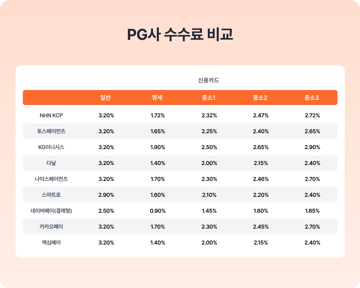 각 PG사마다 수수료가 다르기 때문에, 자신의 쇼핑몰에 맞는 PG사를 선택하는 것이 중요해요. 아래의 표를 참고해보세요.